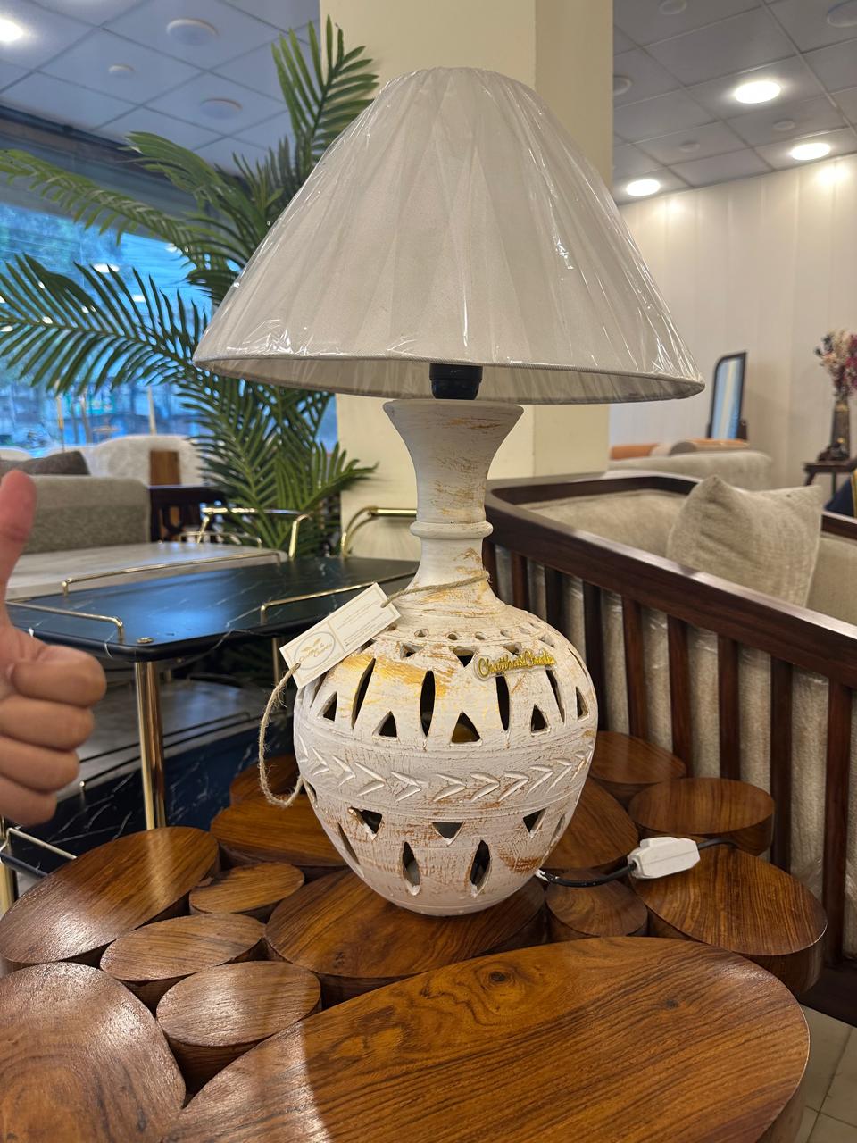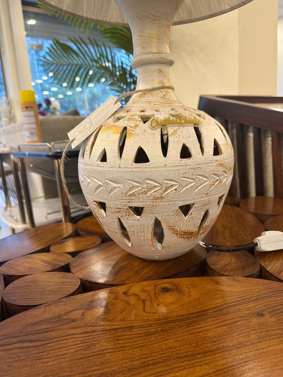 Introducing the Ivory Noor Dual-Glow Lamp — a timeless statement piece that blends vintage charm with soft ambient luxury. Crafted with a distressed ivory ceramic base featuring intricate cut-out detailing, this lamp is designed to glow beautifully from both inside and above.